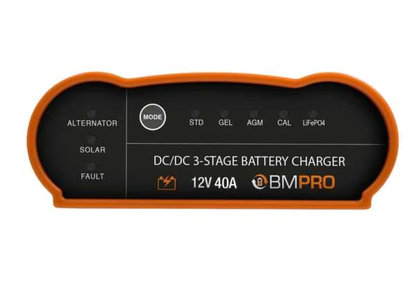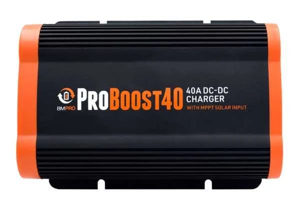 BMPRO Pro Boost 40 a DC-DC battery charger that allows you to properly charge a secondary battery using solar panels and/or a towing vehicle’s 12V electrical system.